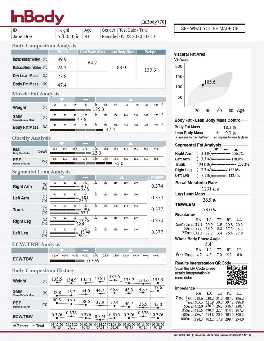 The InBody Research-Grade body composition analyzer provides unparalleled levels of accuracy when it comes to measuring fat, muscle, and body water levels. Each InBody assessment is accompanied by a detailed results sheet. We will walk you through your results and help explain exactly what is going on in your body.